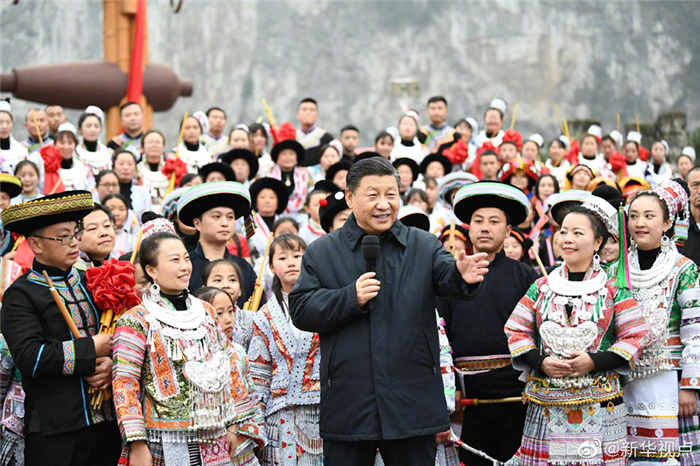 春節(jié)前夕,習(xí)近平總書(shū)記赴貴州考察調(diào)研并看望慰問(wèn)基層干部群眾。3日下午,他來(lái)到畢節(jié)市黔西縣,實(shí)地察看烏江六沖河段生態(tài)環(huán)境,走進(jìn)新仁苗族鄉(xiāng)化屋村看望鄉(xiāng)親們。在村文化廣場(chǎng),習(xí)近平同參加少數(shù)民族春節(jié)民俗活動(dòng)的群眾親切交流,并向全國(guó)各族人民致以新春祝福。