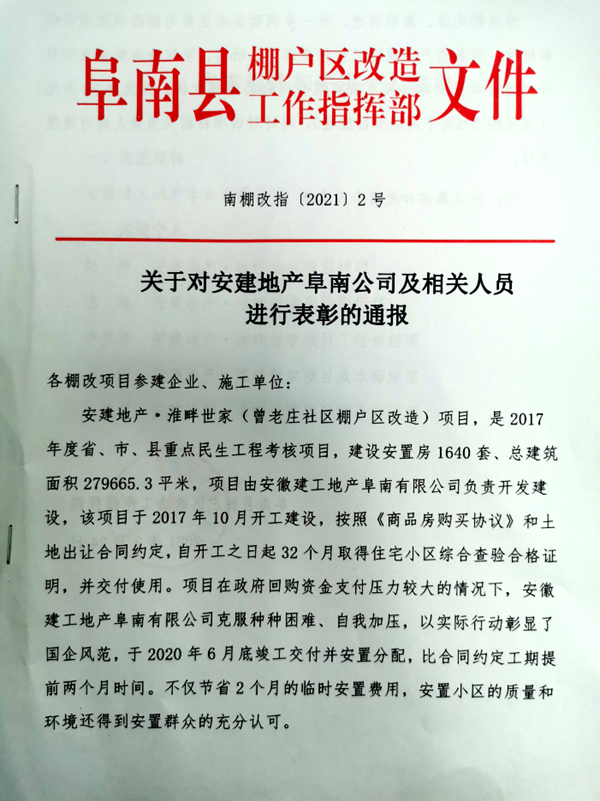 4月6日,由安建地產(chǎn)開(kāi)發(fā)建設(shè)的淮畔世家項(xiàng)目獲得阜南縣棚戶區(qū)改造工作指揮部全縣通報(bào)表彰,并獲得獎(jiǎng)勵(lì)30萬(wàn)元。